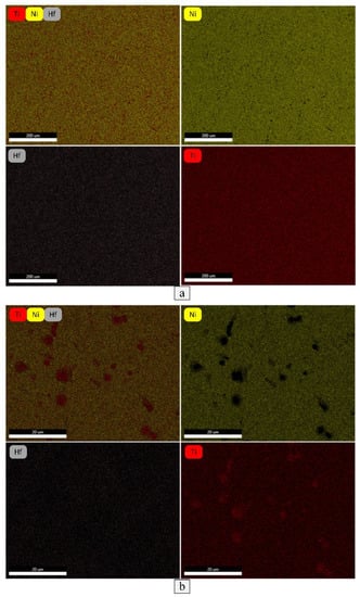 The SEM images, obtained after RF and RF + PDA, are shown in Figure 5. The black rounded and elongated inclusions are associated with the (Ti,Hf)2Ni-type phase based on the results of the EDS analysis (Figure 5). The definition of structural elements and grain/subgrain boundaries is complicated due to the martensitic state of the studied rods at room temperature. The difference in the structural state with the application of PDA was not determined by the SEM, just like after light microscopy. The elemental maps, shown in Figure 6a, indicate the elemental distribution of Ni, Ti and Hf in the obtained rods. Elemental EDS mapping revealed the practically homogeneous distribution of elements, albeit indicating small Ti-rich and Ni-poor areas, presumably corresponding to the (Ti,Hf)2Ni-type particles. The elemental maps, taken with higher resolutions in order to study the elemental distribution along the precipitates and their surrounding matrix, confirm this presumption (Figure 6b).