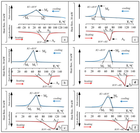 Based on the analysis of the obtained calorimetric curves, summary Table 4 was compiled with the characteristic temperatures of the forward and reverse MTs for the samples of the TiNiHf system.