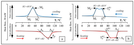 Calorimetric curves of the TiNiHf rods after RF (a) and RF + PDA at 550 °C for 2 h (b).