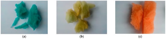 Two types of biomass carriers were selected for preliminary research. The first type includes post-consumer waste material of polyurethane foams in the form of their scrap. Porous soft (flexible) foams and closed-pore rigid (inelastic) foams were used (Figure 1). Soft foams (bluish-green Figure 1a, yellow-green Figure 1b, orange Figure 1c, lilac Figure 1d) were characterized by open pores with different contents. Soft foams with large cells in the structure were less flexible and had lower mechanical strength than foams with finer pores. Due to the denser and more compact cell structure, the latter is characterized by high flexibility and thus is more resistant to mechanical damage. The selection of porous foams was made based on the diameter and size distribution of their cells, porosity, specific surface area, and application properties, which are documented in detail in the previous papers of the authors [8]. The closed-pore rigid PUFs used in the study are shown in Figure 1e,f. This material came from the post-consumer waste of thermal insulation. Inelastic green PUFs were characterized by high strength and greater dimensional stability compared to white polyurethane foams. The irregular shapes of both rigid foams had average dimensions of 3 × 30 mm (width and length).