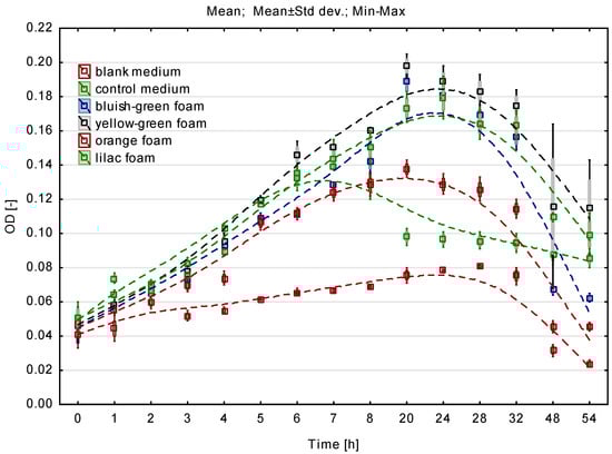 Figure 3 shows the optical density values for groups I–III. The lines marked for carriers in the form of flexible foams (bluish-green and yellow-green) clearly show the stage of microbial growth and their death. For the bluish-green foams in casings, the growth phase was more dynamic (greater inclination angle) and the stationary phase occurred between 10 and 20 h of culture. The biomass cell death phase started after 20 h of culture. In the case of rigid foams with closed pores (white and green) and the conduit itself, there was no linear phase of microbial biomass growth, only cell death.