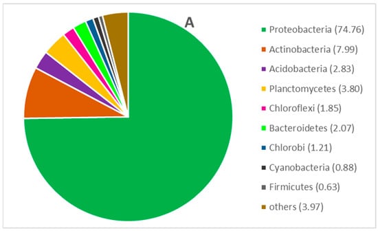 The microbial community structure of the two types of PUR foams was analyzed based on the 16S rRNA gene sequences. A total of 118,320 reads (51,056 in sample A—PUR foam in the conduit and 67,264 in sample B—sole PUR foam without conduit) were analyzed. Using a 97% sequence identity cut-off, 828 OTUs were detected in sample A and 872 in sample B (Table 3). The diversity indexes, i.e., Shannon-Wiener, Simpson, and Margalef’s, indicate high, but at the same time similar level of biodiversity of the examined samples [25]. In general, it is assumed that bacterial population diversity is a positive phenomenon, as it contributes to the stability and resilience of microbial communities when they are challenged by their surroundings [37]. The mechanisms driving the positive relationship between taxon diversity and population resilience may be related to the fact that more diverse communities are more likely to contain taxa with complementary response traits and the ability for rapid compensatory growth after disturbance [37]. This also might be the case for microbial communities inhabiting biomass carriers used for the sewage treatment process, because sewage composition is rarely constant and the probability that the dwelling conditions for bacteria become difficult, is high. Among the detected OTUs, the members of Proteobacteria phylum predominated in both samples (i.e., 74.76 and 67.81% in samples A and B, respectively). The second and third most frequent phyla were: in sample A: Actinobacteria (7.99%) and Planctomycetes (3.80%); in sample B: Actinobacteria (6.32%) and Acidobacteria (6.08%). The dominance of Proteobacteria has been also observed by other authors in their studies on sponge reactors [38,39,40]. The prevalence of most phyla was similar in both samples, only in the case of Acidobacteria, Chloroflexi, and Cyanobacteria the differences in the relative abundance among the two samples were more distinct, in favor of sample B, where the % reads of these groups were approx. twice higher (Figure 6A,B).
