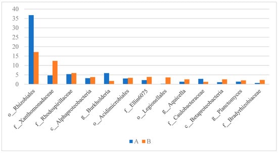 Bacteria belonging to the order Rhizobiales were the most prevalent in both samples, but their abundance in sample A significantly outnumbered sample B (36.76% vs. 17.14%). One of the possible reasons for such a situation might be the lower availability of free oxygen in sample A (PUR foam in the protective pipe) which would promote the proliferation of bacteria capable of respiration under microaerobic conditions, such as rhizobia [46]. Members of Rhizobiaceae have been studied for their nitrification and aerobic denitrification capabilities and they might play important role in sewage treatment processes. Members of the family Rhizobiaceae and the order Rhizobiales were found to be among the top three relatively abundant bacterial populations in experimental sewage treatment ecosystem samples, with relative abundance ranging from 4.9% to even 60.5% [47]. The second most frequent group in our study belonged to the family Xanthomonadaceae, but these bacteria were much more prevalent in sample B (12.43%), whereas in sample A their share was 4.70% and it was smaller than that of genus Burkholderia (5.88%) and family Rhodospirillaceae (5.35%). Members of Xanthomonadales were also found by Yang et al. [47] in the experimental sewage treatment ecosystem in relative abundances ranging from 10.5 to even 78%. These are bacteria capable of performing heterotrophic denitrification, similar to the members of Burkholderiales [41], which were also found by Yang et al. [47] among the top three most abundant populations in one of the samples derived from experimental sewage treatment system with a relative abundance of 9.9%. This group includes Burkholderia sp., which was on the other hand the most abundant genus in sample A and prevailed over their abundance in sample B (24.11% vs. 8.69%; Figure 8). The genus Aquicella, which was, on the other hand, the most prevalent in sample B, was also found among the dominant microorganisms in a tidal-flow constructed wetland, aimed at wastewater treatment and proved to have nitrogen removal properties [48]. Figure 8 shows the most prevalent bacterial genera identified in the examined samples. The majority of these bacteria are capable of denitrification, nitrification, and other—not yet precisely determined—nitrogen removal properties. Therefore, similarly as concluded by Mahajran et al. [38], the abundant presence of these microbial communities (Figure 8 and Figure 9a,b) indicates the simultaneous occurrence of nitrification-denitrification processes occurring in the examined reactors [49]. However, what needs to be mentioned, is that the abundance of nitrifying bacteria in the examined samples is much lower than that of denitrifying bacteria (Figure 9a,b), which has been also reported by other authors in microbial community analysis in sponge reactors [40,50]. In columns A and B, Nitrosomonas constituted 0.34 and 0.76% of all reads, respectively, while Nitrospira constituted 0.65 and 0.48%, respectively (Figure 9a).