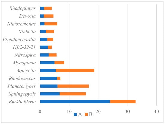 The occurrence of types of bacteria removing non-ionic forms of nitrogen differed in both samples. Planctomyces, which can remove ammonium nitrogen by the anammox process, accounted for 1.31 and 1.90% of all reads in samples A and B, respectively (Figure 11).