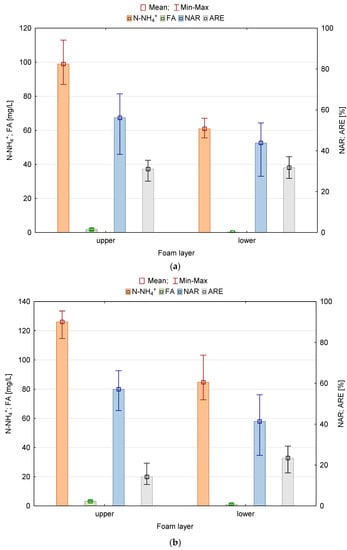 A high degree of inorganic nitrogen removal of 51.5% was observed in the two spongy layers of column A filled with waste foams in full casings. Sewage flowing out of the lower layer of column A was characterized by the mean concentration of ammonium, nitrite, and nitrate nitrogen of 60.9 mg·dm−3, 8.3 mg·dm−3, and 7.1 mg·dm−3, respectively. In column B, where the PUR foams were without casings, the efficiency of removing non-ionic nitrogen forms was lower by 15.6%. This was affected by smaller numbers of denitrifiers (Figure 11B). The mean concentration of ammonium, nitrite, and nitrate nitrogen in wastewater discharged from the lower layer of column B was 84.8 mg·dm−3, 9.7 mg·dm−3, and 6.4 mg·dm−3, respectively. Apparently, the high removal of N-NH4+ was caused by nitrifying bacteria and anammox bacteria, the presence of which was confirmed in the spongy filling of both biomass carriers.