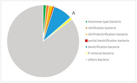 Bacterial community structure shown as the percentage share of anammox bacteria, nitrifiers, denitrifiers, and P-removing bacteria in the two types of PUR foam samples ((A) and (B) refer to the PUR foam samples (A) and (B), respectively).