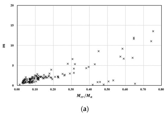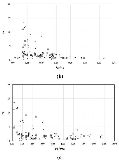 To derive the value of parameter m, the correlation between the M c r / M a , ρ f / ρ f b , and I c r / I g relationships are presented in Figure 2a–c. As shown in Figure 2a, the lower the ratio of M c r / M a , the lower the value of m. In addition, as shown in Figure 2b,c, the parameter m is relatively dependent on ρ f / ρ f b and I c r / I g . According to Branson’s Equation (2), when the load increases, the moment of inertia is interpolated between the area moment of inertia and the moment of inertia of the cracked transformed section. Thus, in Branson’s Equation (2), the reduction factor must be multiplied to estimate an effective moment of inertia value that is smaller than the moment of inertia of the cracked transformed section.