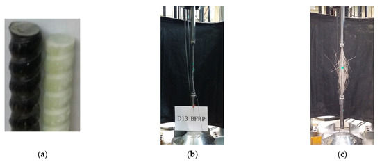 Figure 3. FRP rebar and tensile test: (a) Surface of GFRP and BFRP; (b) Test set up for tensile test; (c) Failure mode of FRP rebar.