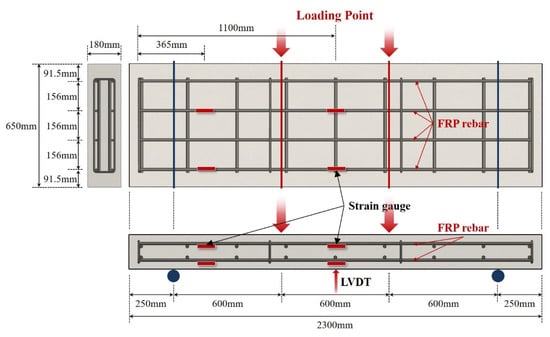 The FRP-reinforced concrete member was designed as a one-way slab in which the FRP rebar was laid transversely. The deflection was analyzed according to the effective moment of inertia in terms of the FRP rebar type and the FRP reinforcement ratio. As shown in Figure 4, the specimen has the width and height of 650 × 180 mm, a cover of 46.5 mm, a total length of 2300 mm, and a pure span of 1800 mm (the blue circle in the Figure 4). The flexural test was performed by placing a reaction force hinge at a distance of 250 mm from both ends in a four-point loading method. The actuator device was used to apply the load at a rate of 2 mm per minute at a distance of 300 mm from the center of the upper part of the specimen to both sides (the red line in the Figure 4). Data of the load and deflection were measured to determine the behavior of the one-way slab in response to the applied load. The applied load was measured through a load cell attached to the actuator, and the experimental midspan deflection value was measured using an LVDT (Linear Variable Displacement Transducer). The load data and deflection data of each FRP-reinforced member were automatically collected by a TDS-303 data logger device. Data of the load and deflection were measured once per second.