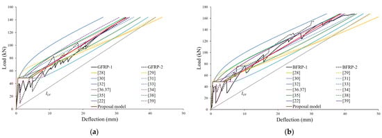 Figure 6. Comparison of analytical load–midspan deflection of FRP-reinforced concrete specimens: (a) GFRP-reinforced concrete specimens; (b) BFRP-reinforced concrete specimens.