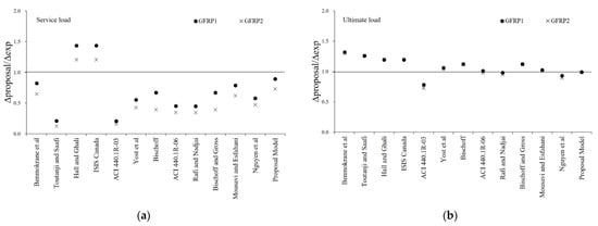Figure 7. Experimental versus predicted midspan deflection of GFRP Specimens: (a) Ratio of experimental and predicted deflection at service load; (b) Ratio of experimental and predicted deflection at ultimate load.