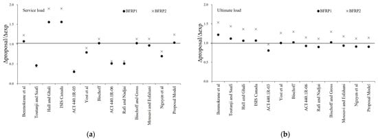 Figure 6a,b compare the experimental midspan deflections for GFRP and BFRP specimens to the deflections predicted using different proposed models of the effective moment of inertia. In this study, the service load is assumed to be 40% of the ultimate load. Figure 6a shows that for the GFRP specimen corresponding to the balanced reinforcement ratio, the models of effective moment of inertia proposed by ACI 440.1R-03 [32], ACI 440.1R-06 [34], and Nguyent et al. [39] were found to underestimate the values of all states of the load after cracking. The model of Toutanji and Saafi [29] was shown to underestimate deflection at the service load stage by predicting too much stiffness after the initial load but overestimating the ultimate load. Figure 6b shows that for BFRP specimens corresponding to the compression-controlled section, only the model of ACI 440.1R-03 [32] was found to underestimate the values in all states of the load after cracking. Regardless of the FRP reinforcement ratio of the specimens, the models of Hall and Ghali [30] and the ISIS Canada Design Manual [31] showed the most conservative deflections. The model of Benmokrane et al. [28] predicts similar deflection for all specimens at the initial load but tends to overestimate the deflection the most at the ultimate load.