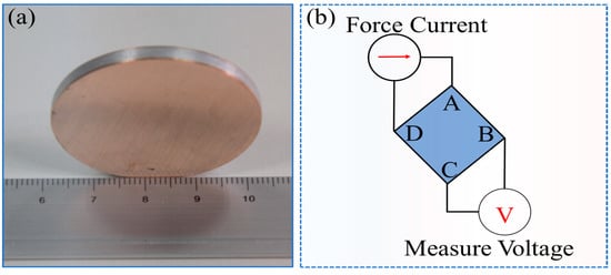 The experimental specimens are shown in Figure 2a. The hot pressing samples were cleaned and smoothed by 1200 grit sandpaper and tested for conductivity by the van der Pauw method (vdP, Keithley 2182A, Cleveland, OH, USA). The principle is illustrated in Figure 2b. This measurement method was used on a small, flat-shaped sample with four terminals and a uniform thickness. A current is applied to the sample through two terminals and the voltage drop is measured through the opposite two terminals.
