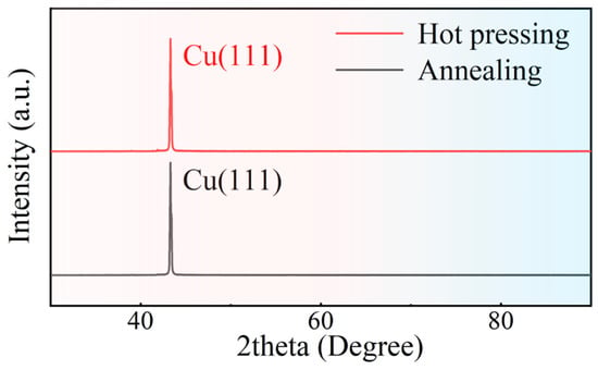 Figure 3 shows the XRD result of the Miller indices of copper foil after annealing and copper block after hot pressing. The main peak appears at 2θ approximately 42°. It can be clearly seen that the Cu block remained in the single crystal state after being twice hot pressed. Cu(111) has the lowest surface energy of 1.387 J/m2 calculated by the first natural principle [21], which results in the lowest Cu(111) formation energy and the easiest nucleation to Cu(111) when the crystal reaches the recrystallization temperature. A sample is obtained of Cu(111) foil and Al after two hot pressings. Due to the lowest Cu(111) Miller indices formation energy and the low temperature of the sample after two hot pressings, there was not enough energy to nucleate Cu(111) to other surfaces, resulting in the Cu sample remaining in a single crystal state. The presence of grain boundaries in polycrystals can lead to electron scattering, which affects the electrical conductivity of Cu, whereas single crystal Cu has only one grain without electron scattering at the grain boundaries, which helps the electrical properties of the sample. It can be seen from the figure that the Miller indices of the Cu foil do not change before or after hot pressing, ensuring a single crystal on the Cu(111) surface.