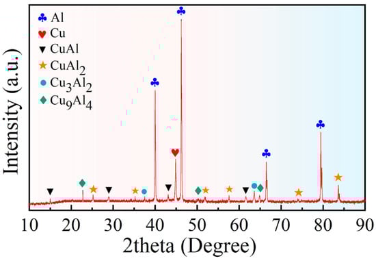 Figure 6 shows the XRD analysis results of the Cu/Gr-Al-Cu/Gr laminated composites sample cross section. It can be found that four different intermetallic phases, i.e., CuAl2 (2θ ≈ 25°, 36°, etc.), CuAl (2θ ≈ 15°, 29°, etc.), Cu3Al2 (2θ ≈ 37°, 63°), and Cu9Al4 (2θ ≈ 23°, 66°) are obtained. Combined with the XRD analysis it can be seen that the four different color diffusion layers in Figure 5b are four different phases.