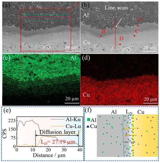 (a) SEM images of diffusion layer morphology; (b) SEM image of the sample surface scanning area and A, B, C, D are point scanning areas; (c) Distribution of Al elements; (d) Distribution of Cu elements; (e) Sample line scan area and energy spectrum; (f) Cu and Al diffusion diagram.
