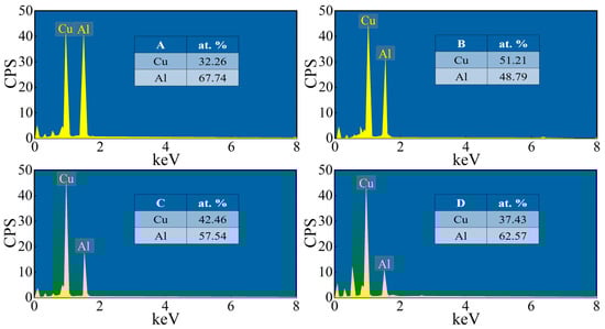 Figure 8 shows the EDS of points A–D in Figure 7b. Point A is close to the aluminum side, which can be identified as the CuAl2 phase by combining the XRD and EDS results of point A. Point B is closer to the copper side than point A, and the CuAl phase can be determined from the XRD and EDS results. The EDS results and XRD analysis at point C confirm that this is the Cu3Al2 phase. Point D is close to the copper side, and the EDS results and XRD analysis determine that this is the Cu9Al4 phase. Therefore, the intermediate phases from the Al side to the Cu side are CuAl2, CuAl, Cu3Al2, and Cu9Al4 in that order.