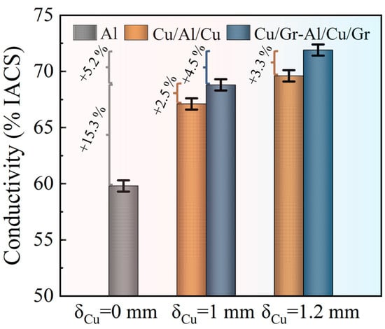 The electrical conductivity of the sample with different Cu(111) and Cu(111)/Gr thicknesses are shown in Figure 9. This work considered three different Cu(111) and Cu(111)/Gr thicknesses, i.e., 0 mm (Al), 1 mm (Cu/Al/Cu and Cu/Gr-Al-Cu/Gr), and 1.2 mm (Cu/Al/Cu and Cu/Gr-Al-Cu/Gr). It should be noted that as the thickness of Cu changes, the number of graphene layers changes. It can be seen that for the sample with a layer thickness of 1 mm, the electrical conductivity reached 68.8% IACS, which is 2.5% higher than the 67.2% IACS of the same sized sample without graphene. Meanwhile, for the sample with a layer thickness of 1.2 mm, the electrical conductivity is 71.9% IACS, which is 3.3% higher than that of Cu/Al/Cu without graphene (69.6% IACS). In addition, it is known that the number of graphene layers introduced by increasing the thickness of the Cu(111)/Gr layer also increased, and it was found that the sample’s electrical conductivity improved considerably after graphene was added. For example, by comparing the sample of Cu/Gr-Al-Cu/Gr with the thickness 1mm and 1.2mm, the electrical conductivity is increased by approximately 4.5% from 68.8% IACS to 71.9% IACS, whereas for the Cu/Al/Cu samples without Gr, the electrical conductivity is increased by approximately 3.6% with thicknesses increased from 1 mm to 1.2 mm. Furthermore, it can also be seen from Figure 9 that the graphene-embedded Cu/Al composite exhibited high carrier mobility from controlled experiments, and the resulting samples showed a maximum enhancement of 20.5% over the raw material Al.