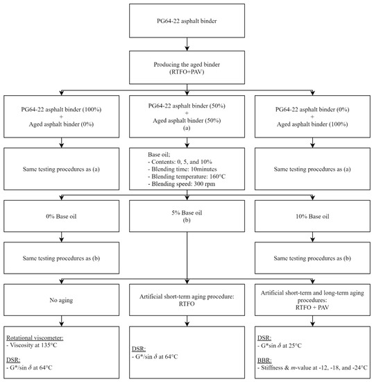 In this study, the main objective was to assess the effect of base oil on the aged binder. First, to extract the aged binder, a rolling thin-film oven (RTFO) and pressure aging vessel (PAV) were used to imitate the life cycle of asphalt pavement from production to service life, and then each content of aged binder (0%, 50%, and 100%) was added to PG 64-22. Next, each type of aged asphalt binder prepared was blended with a base oil (0%, 5%, and 10%). Finally, as an evaluation method for the asphalt binder, the Superpave test was adopted to understand how the base oil behaved in each aged asphalt binder. Figure 1 shows the flow chart used for this study.
