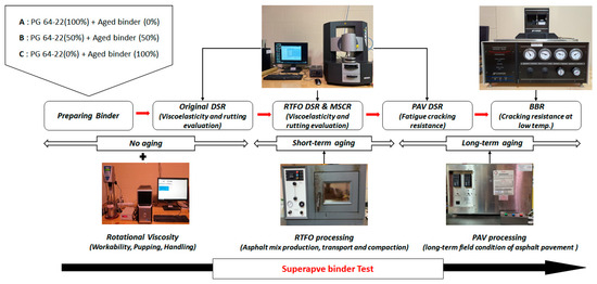 Superpave binder tests were adopted to evaluate the characteristics of asphalt binders. To conduct each binder test, all asphalt binders were conditioned in three stages of original, short-term aging (RTFO), and long-term aging (PAV) conditions. Rotational viscosity (Test Method D 4402), dynamic shear rheometer (Test Method D7175), and bending beam rheometer (AASHTOT 313) tests were performed. Figure 3 shows the procedure of the Superpave binder test in this study.