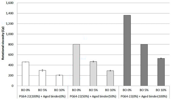 The viscosity of asphalt binder is a key to evaluating whether its workability can be adequate on the field site. To evaluate the workability, asphalt binder was assessed by a Brookfield rotational viscometer (Figure 4) at a temperature of 135 °C, applying the 27 cylindrical spindle and constant 20 rpm with 10.5 g of original asphalt binder in accordance with AASHTO T 316. The operation time to obtain the viscosity results was adopted as 20 min for all samples. The rheological property using a dynamic shear rheometer (DSR) was analyzed with samples of unaged, RTFO, and RTFO + PAV binder according to ASTM D7175. The results of G*/sin δ were collected on the basis of the results of the complex shear modulus (G*) and sine (δ) of the phase angle at 64 °C. To figure out the fatigue cracking at ambient and low temperatures, RTFO + PAV binders were used to obtain the results of G*·sin δ by DSR and of stiffness and m-value by a bending beam rheometer (BBR). In the case of G*·sin δ, it was measured at 25 °C to examine fatigue cracking properties. For cracking properties at low temperatures, the BBR test began by forming asphalt beams (125 × 6.35 × 12.7 mm) and placing these beams inside of the BBR based on the suggested standard. Finally, the stiffness and m-value were calculated by applying a constant load of 100 g to the center of the asphalt beam. At this point, in order to analyze the comprehensive effect of base oil on aged asphalt binder, considering that the stiffness increase when RAP is applied to the asphalt mixture, diverse temperatures of −12 °C, −18 °C, and −24 °C were considered.