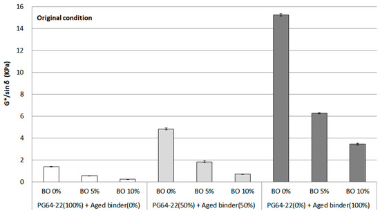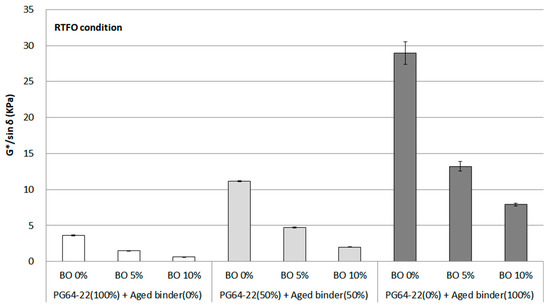 DSR is the most common tool for assessing the rheological property of asphalt binder based on the G*/sin δ factor. For example, the higher the G*/sin δ that the asphalt binder shows, the higher the indicated rutting resistance. However, if the asphalt binder is excessively stiff, even if the G*/sin δ is high, there will be a risk of cracking, or workability cannot be ensured. Therefore, additional evaluations should be considered to look into the overall properties of asphalt binders. In this study, the original G*/sin δ was measured at 64 °C, as shown in Figure 5. A dramatic increase in G*/sin δ was seen from 0% to 100% aged binder, with the value reaching a peak of approximately 15 kPa without using the base oil. This is because the stiff characteristics originated from the proportion of asphaltene increasing during the aging procedure. According to several studies [15,16], the asphaltene portion in asphalt binder increases as it is aged by oxidation. However, using 5% base oil, the value of G*/sin δ dropped to almost half from using 0% base oil in each binder. In the case of using 10% base oil, the value decreased by about four times or more. Therefore, the base oil is considered adequate for the aged binder because the asphaltene is well diminished by softening the asphalt binder. Another implication of these results found in this study is the potential that even if 50% of the aged asphalt binder is used, it can be regenerated as much as PG 64-22 binder using 5% base oil.