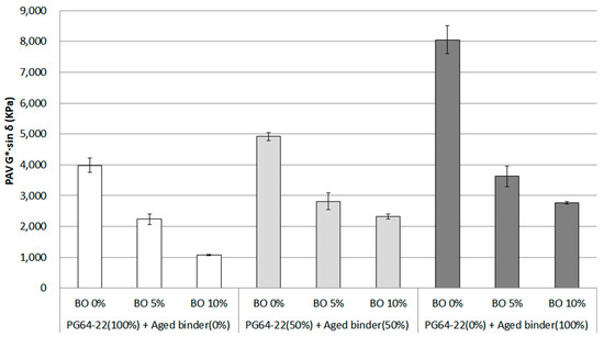 G*·sin δ of each asphalt binder containing the base oil for RTFO + PAV condition.