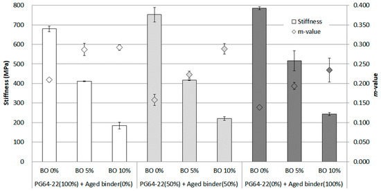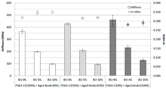 In the results conducted at a temperature of −18 °C shown in Figure 9, the stiffness exceeded 300 MPa without using the base oil. However, all data showed that the stiffness was achieved using a base oil resulting in less than 300 MPa. It was shown that the stiffness decreased to about 200 MPa at each aged binder containing 5% base oil, but the result of using 100% aged binder revealed that the m-value was not over 0.3. Even with this result, the base oil was considered to have a positive effect due to the dramatic decrease in stiffness and reducing asphaltene in the aged binder.