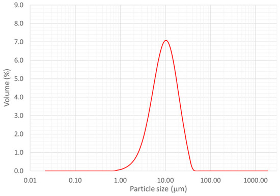 The powders used to deposit the HEAs coatings were prepared with an ink of a mix of five mono-element industrial powders (>99% of purity) of Alpha Easar (Haverhill, MA, USA). The average granulometry of elements was for Fe: <10 µm, Al: 7–15 µm, Mn: <44 µm, Cr: <44 µm, and Mo: 3–7 µm. The curve in Figure 1 shows the grain size distribution of the mix realized from commercial mono-elementary powder, to confirm the grain size is more homogeneous after mixing.