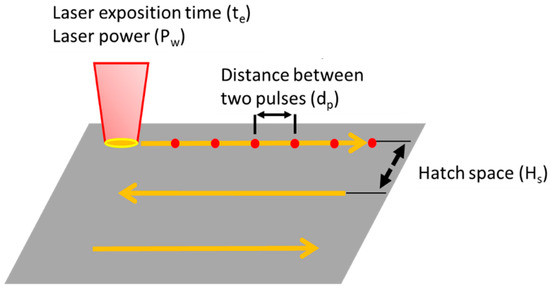 The SLM machine used in this study was a RenishawAM125 (Renishaw, Wooton-under-Edge, Gloucestershire, UK). It uses a high-power (Pmax = 200 W (cw)) fiber laser (λ = 1070 nm) and comprises a building chamber of 125 × 125 × 100 mm3 size, which is swept by argon to maintain an inert gas environment. The main parameters for fine-tuning processing are illustrated in Figure 3: Laser power (Pw); Laser exposition time for each point (te); (d) hatch space (HS), defined as the distance between two consecutive parallel laser tracks; and (e) distance between two pulses (Pd), defined as the distance between two consecutive laser spot area irradiated. Table 1 summarizes the deposition conditions.