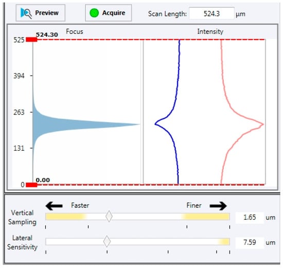 Contour LSK Bruker Interface. Histogram on the left represents the focus information curve. On the right, blue curve represents the lower intensity of pixels and the red one the higher intensity.