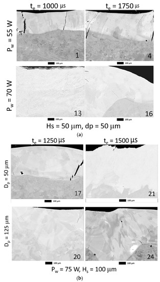 Images of the cross-section of coatings obtained by optical microscopy. The number (a) for Hs = 50 µm and dp = 50 µm (b) Pw = 75 W and Hs = 100 µm.