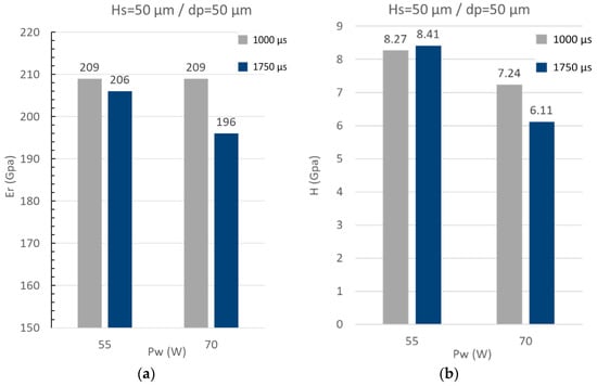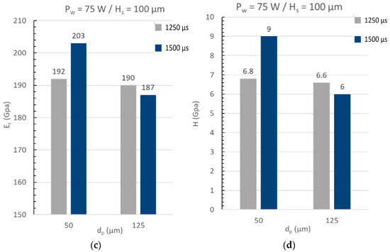 Graphs of hardness and reduced elastic modulus for different conditions of coatings. (a) Young modulus Er for Hs = 100 µm and dp = 50 µm with two laser exposition time of 1000 µs and 1750 µs; (b) Hardness H for Hs = 100 µm and dp = 50 µm with two laser exposition time of 1000 µs and 1750 µs; (c) Young modulus Er for Pw = 75 W and Hs = 100 µm with two laser exposition time of 1250 µs and 1500 µs; (d) Hardness H for Pw = 75 W and Hs = 100 µm with two laser exposition time of 1250 µs and 1500 µs.