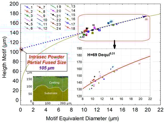 By extending the linear approximation, we end up with a motif height of 105 μm (cf. red circle of Figure 18). This asymptotic value leads to the limited height of the pattern. This value of 105 μm is reached for a zero-equivalent diameter. It represents a melted height free of diameter. The physical interpretation implies a total absence of non-melted particles, so the melting of sprayed powders is completed. The coating thickness may be reached when all the balls are melted; in other words, the asymptotic value represents the thickness of the ideal homogeneous coating sprayed.
