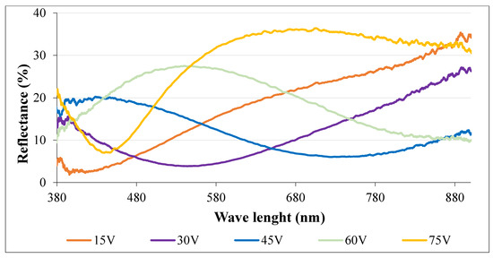 The surfaces were tested for reflectance characteristics. Only wavelengths of visible light were used for testing. The varying intensity of reflected light for single wavelengths was recorded. The graphical interpretation of reflectance specters for each anodic coloring voltage is presented in Figure 2, where the colors of curves represent the color of the surfaces.