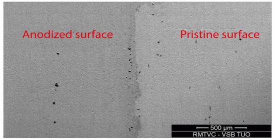The morphology changes caused by anodization process were studied by SEM methods. The major variation was observed in BSE mode, when the area of anodic coloring appears darker due to formation of titanium oxide layer based on TiO2 on the surface [4,22]. Figure 3 illustrates the interface between an anodized and non-anodized surface and indicates that there was no significant difference in surface topography found on the anodized surface.