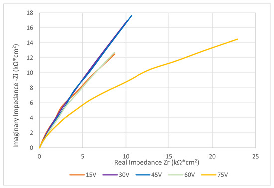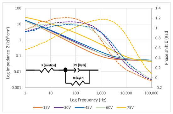 The effect of anodization on electrochemical properties was studied by electroimpedance spectroscopy to find curves of electrical impendence. Characteristic impedance curves presented in Figure 4, Figure 5 and Figure 6 show the impedance shift for each anodization voltage. There is a significant difference between 75 V and the rest of curves. There is an assumption that anodization at high voltage produces very compact surface layers with highly organized titanium oxide in its microstructure. This layer contains less microdefects and behaves like a highly effective electric insulator [42]. As there is large amount of oxygen molecules developed in anodization process at higher voltage, there in not enough time and driving force to react with titanium atoms and form into a deffectless structure. Therefore, the samples anodized at higher voltage show a different shape of impedance curve as the colored layer on their surface probably contains high amount of morphologic defects [43]. The summarized resistance of the solution was very close for all samples, signaling a similarity to the constant testing conditions. The resistance of the anodized layers obtained by EIS showed the same trend as resistance obtained by potentiodynamic polarization. The difference between the two values is probably caused by the dynamics of electric charge transfer across the anodized layer [44]. The values of capacitance of the anodized layers are independent of the voltage of anodization, signaling that the layers show similar physical and electrochemical properties [45]. Surfaces anodized at 75 V show significantly lower values for both the layers’ resistance and capacitance. This phenomenon might be caused by microscopic defects formed due to high oxygen evolution during the anodization process at high voltage, resulting in the formation of cavities, microcracks, or even microblistering [14]. The insulating parameters of the defective layer are therefore decreased, resulting in lower resistance [46] and layer capacitance [11].