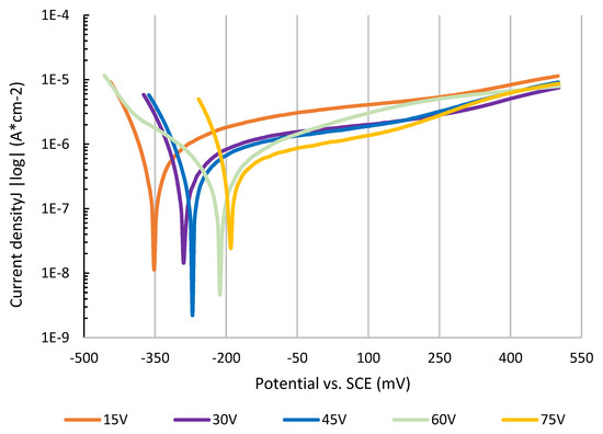 One polarization curve was measured for every anodically coloured surface. The relation of corrosion current on polarization potential was recorded during the polarization procedure. Common corrosion parameters were determined by Tafel extrapolation [27] on the curves. Polarization curves are presented as a semilogarithmic axial system to illustrate the value of corrosion potentials. This was done in a typical “V-like” shaped area of the curve, where anodic reactions begin to predominate over cathodic ones. The measurement procedure was automatically terminated when either potential reached 500 mV SCE. The relation of corrosion current on polarization potential is illustrated in Figure 6.