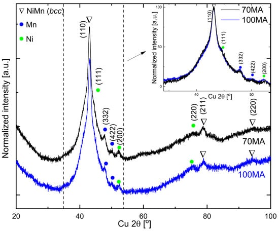 XRD patterns of as-milled powders produced by mechanical alloying for 70 h (70MA) and 100 h (100MA). Inset—superimposed XRD patters restricted to the region between dotted lines.