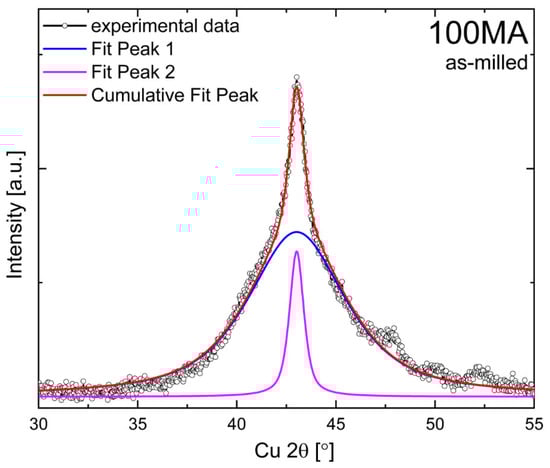 Pseudo-Voigt curves fitted to experimental XRD pattern of as-milled 100MA.