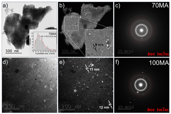 Figure 3 shows bright-field (BF), dark-field (DF), and selected area electron diffraction pattern (SAEDP) observed by TEM for the as-milled powder after 70 h of mechanical alloying. In the DF image (Figure 3b), one can see the nanocrystallites (white spots). The average crystallite size is 9.5 (3.3) nm (inset, Figure 3a). Additionally, the TEM results, i.e., significant broadening of the main ring in the SAEDP (Figure 3c,f), confirm the presence of the nanocrystalline/amorphous phase. It stays in good agreement with the XRD measurement for which the broadening of the (110)bcc matrix reflection was observed as well.