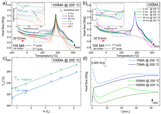 DSC heating curves recorded at 30 °C/min for 100MA as-milled powder and after annealing: (a) at 200 °C for 2 min, 5 min, 30 min, 1 h, 1.5 h, 50 h; (b) for 5 min at 200 °C, 225°C, and 250 °C and for 30 min, 45 min. Insets-magnified regions marked by dashed rectangular. Relaxation temperatures Tre (Tre–onset, Tre–midpoint) pointed out by coloured arrows. (c) plot of Tre vs. ln(ta), ta—time of annealing at 200 °C; (d) isothermal DSC curves at 200 °C and 250 °C for 70MA and 100MA powders.