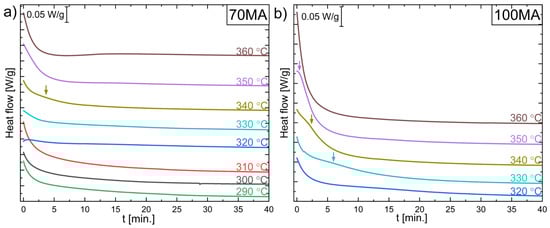 DSC isothermal curves collected at 290 °C, 300 °C, 310 °C, 320 °C, 330 °C, 340 °C, 350 °C, and 360 °C for powder after (a) 70 h (70MA) and (b) 100 h (100MA) of mechanical alloying. Coloured arrows mark the weak broad peaks.