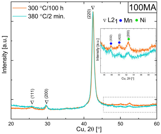 As mentioned above, during non-isothermal heating (Figure 4), two peaks related to P1, P2 and amorphous phase crystallization (black arrows in Figure 4) were observed. In order to explain the effects related to each peak, the appropriate heat treatment should be applied. To obtain powder for which the P1 process accomplished but P2 did not yet start, 70MA and 100MA samples were annealed at 300 °C for 10 min, 2 h, 4 h, 20 h, 100 h, at 330 °C for 45 min, 20 h, at 340 °C for 1 h, 380 °C for 2 min and 1 h. Figure 7 shows DSC heating curves recorded with a 30 °C/min heating rate. One can see that the profile (shape) of the DSC peak for the samples 70MA annealed at 380 °C for 2 min and for 100MA annealed at 300 °C for 20 h and 100 h look similar to as-milled powder P2 fitted curve (Figure 7a—inset). It means that for powders annealed at those conditions, process P1 seems to be accomplished. The XRD was applied to determine the phase composition changes during the sample annealing. In specimen 100MA annealed at 300 °C for 100 h and 380 °C for 2 min, L21 Heusler-ordered phase and residual Ni, and Mn (also observed in the as-milled powders) were determined (Figure 8). One can see that annealing the powder at a lower temperature and for a longer time (at 300 °C for 100 h) allows us to obtain the powder of the same phase composition as for that annealed at a higher temperature for a shorter time (380 °C for 2 min). Additionally, during annealing, the ordering process occurs, bcc-disordered solid solution transforms into L21 Heusler-ordered structure. It will be discussed in detail in Section 3.4.