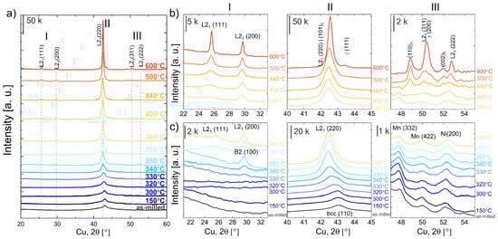 The XRD diffraction patterns of as-milled and 100MA powders annealed at 150 °C, 300 °C, 320 °C, 330 °C, 340 °C, 350 °C, 360 °C, 380 °C, 400 °C, 440 °C, 500 °C, and 600 °C for 2 min taken at room temperature are depicted in Figure 9. The XRD data presents the evolution of the phases (and/or the phase creation) in 100MA powder during the annealing. The data were analyzed in terms of: the ordering process (region I—from 21 to 32° 2θ), crystallite size (region II—from 40 to 45° 2θ) and structural changes related to the residual Mn, Ni presence (region III—from 47 to 55° 2θ). For better clarity, XRD results for samples annealed between 380 °C and 600 °C and between room temperature (as milled) and 380 °C were presented separately in Figure 9b,c.