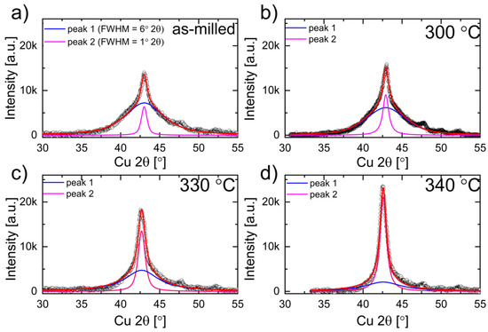 Fitted curves to experimental XRD patterns (black circles) of 100MA powders: (a) as-milled (RT), and annealed at: (b) 300 °C, (c) 330 °C, and (d) 340 °C. The fitted summary peak line profile (red line) composed of peak 1 (blue curve) which corresponds to the amorphous fraction and peak 2 (pink curve) to the crystalline fraction observed in 100MA powders.