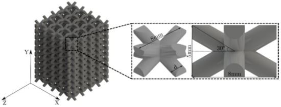This work aims to tailor the mechanical properties of lattice structures at two different levels: (i) functionally graded modification of the strut cross-section and (ii) layered distribution of unit cells. The lattice structures are built with unit cells similar to the BCC. The angle of the inclined struts was modified from ° to ° as a result of the strut cross-section variation; struts overlap at locations near the central node of the unit cells, and by changing the inclined angle to 30° this is avoided. The structures were modeled in Solidworks® (v2020, Dassault Systèmes, Waltham, MA, USA), using unit cells with dimensions of mm, and a nominal volume mm3. The lattice structures are comprised of unit cell arrangements of in the XZ-plane and unit cells on the Y-axis, as shown in Figure 2. The dimensions of the unit cells were selected considering the resolution of the 3D printers used to manufacture the samples.