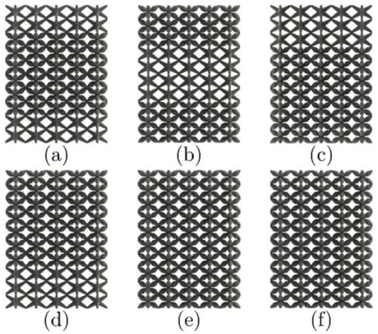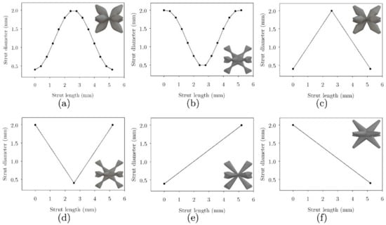 Lattice structures with cross-section variation of the strut. Type of variation (a) COS, (b) COS2, (c) DS, (d) DIS, (e) PS, and (f) NS.