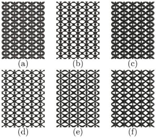 Layered lattice structures. (a) HM-LM-HM (b) LM-HM-LM (c) HM-IM-LM (d) LM-IM-HM (e) IM-LM-IM (f) LM-IM-LM.
