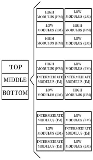The second level controls the unit cell distributions layer-by-layer, i.e., layered lattice structures (LLS). Six LLS were designed considering an initial finite element simulation of the structures under compressive loading shown in Figure 4. From these simulations, their stiffness was measured so that these were labeled as lower elastic modulus (LM), intermediate elastic modulus (IM), and higher elastic modulus (HM). The lattice samples were divided into three zones (bottom, middle and top) to accommodate the unit cells with different elastic moduli, as illustrated in Figure 5. The number of unit cell layers in the zones mentioned above is adjusted for each proposed structure to match their relative densities. Figure 5 shows a labeling scheme used for the LLS arrangements studied: HM-LM-HM stands for a structure with a low elastic modulus in the middle, and high elastic modulus in the top and bottom zones. The remaining structures studied have the following arrangements: LM-HM-LM, HM-IM-LM, LM-IM-HM, LM-IM-LM, and IM-LM-IM. The arrangements were proposed in this way to obtain structures with three zones of different stiffness and in turn avoid having the same stiffness in consecutive zones.